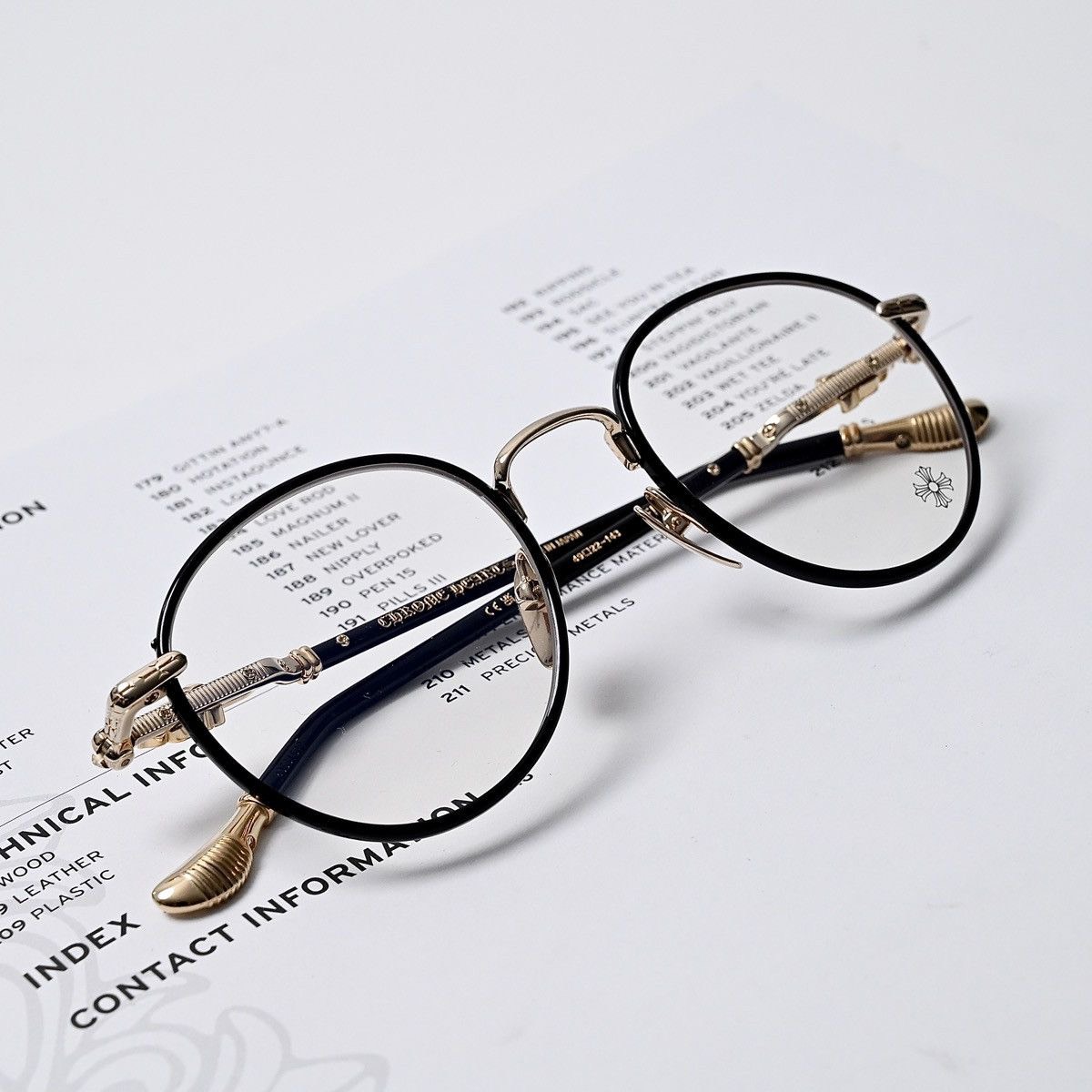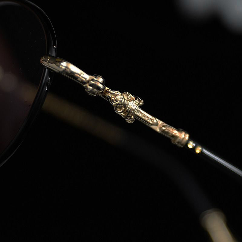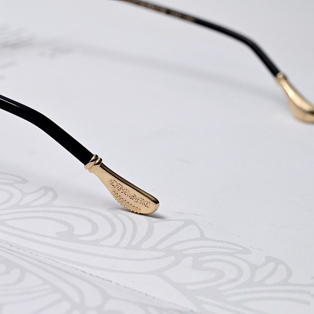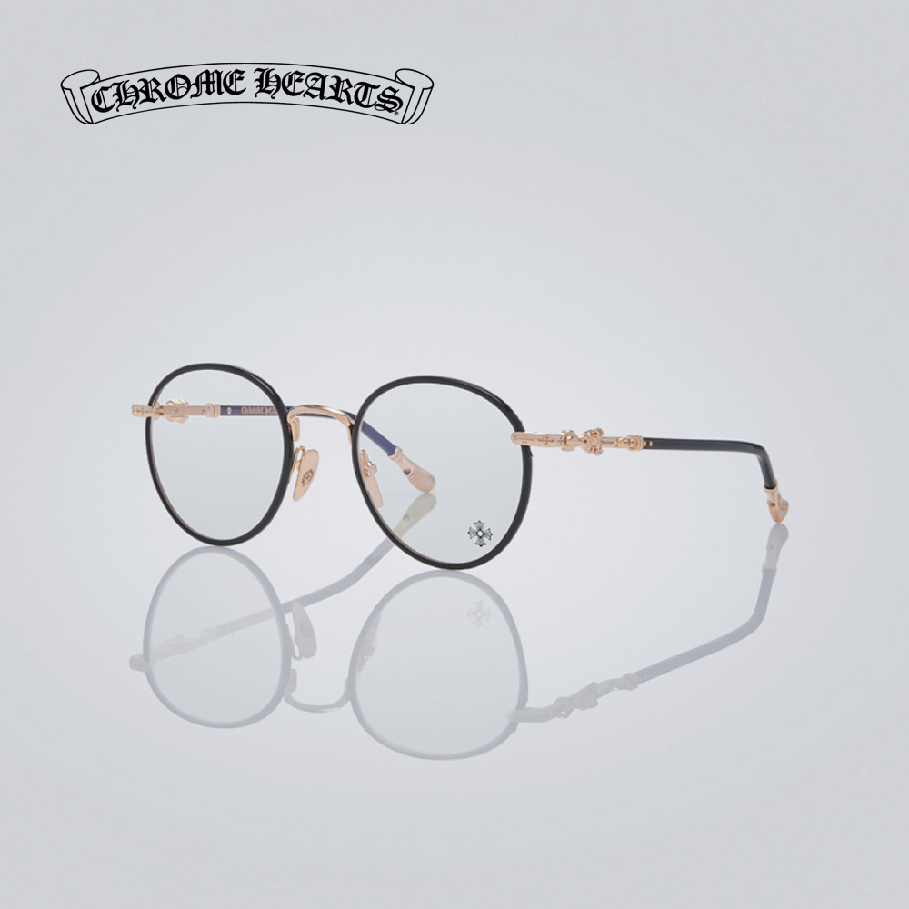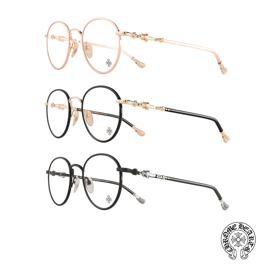 全框擁有6個925純銀銀飾,鏡臂鈦金屬部件銜接匕首與十字架銀飾,鏡腳末端CHROME HEARTS 刻字銀飾。均衡的配重比例,佩戴一整天也很舒適,黑銀、黑金、粉金,三色現貨不用等。